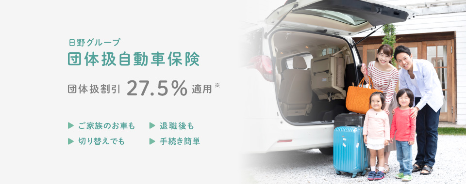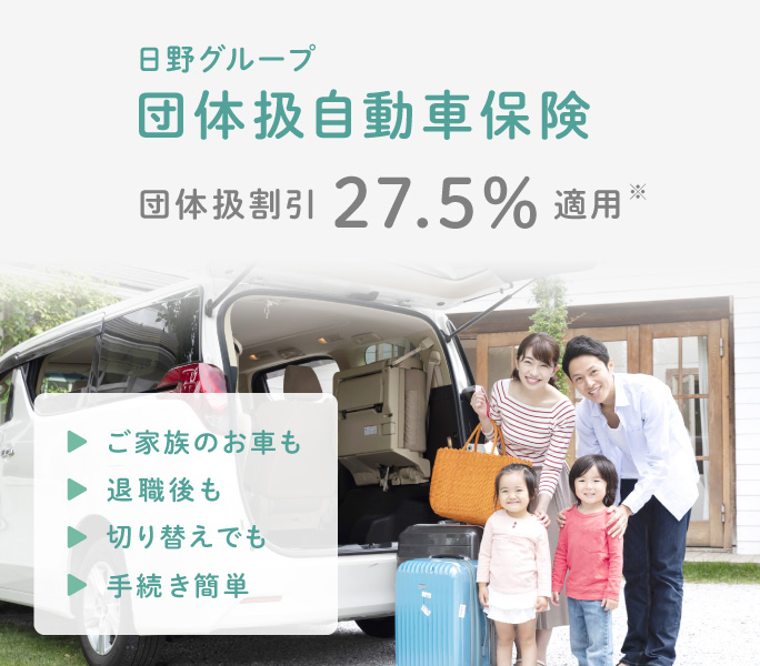 ・団体扱自動車保険のご契約者は日野グループに勤務し、日野グループから毎月給与の支払いを受けている方(在籍出向者、職域労働組合または 職域共済組織の事業に従事している方を含みます。)、退職派遣者および退職者に限ります。